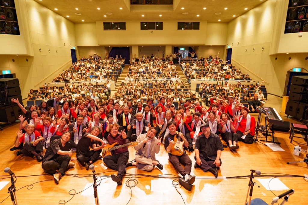 Gospel Choir Angelic Shout!は北九州、福岡、秋吉台、宇部の4地区を拠点に活動し、年に一度、全地区勢ぞろいして「全員集合ライブ」を行うとのこと。