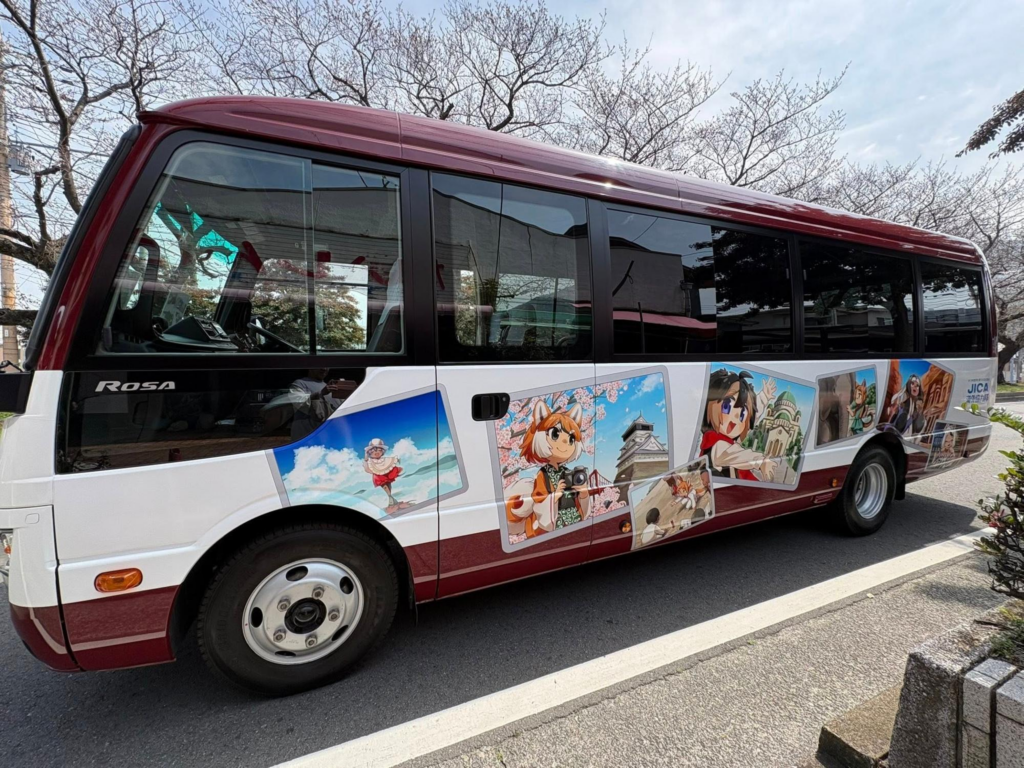このバスは、左右に協力隊が派遣される国のイラストがアニメ的風に描かれており、アニメの聖地として知られている北九州ならでは。