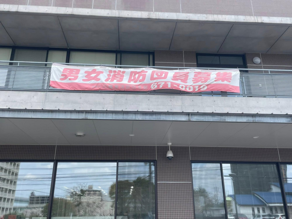 八幡東区大谷インター近くの八幡東消防署には消防団員募集の横断幕