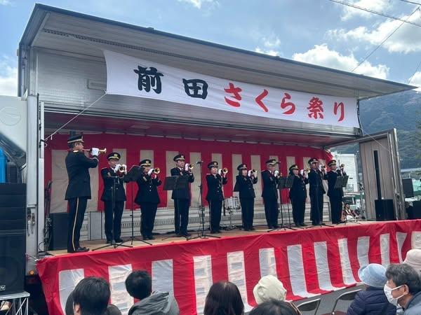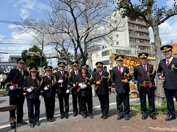 前田さくら祭りにて。消防団の大ファンである八幡東区長と消防団のみなさま