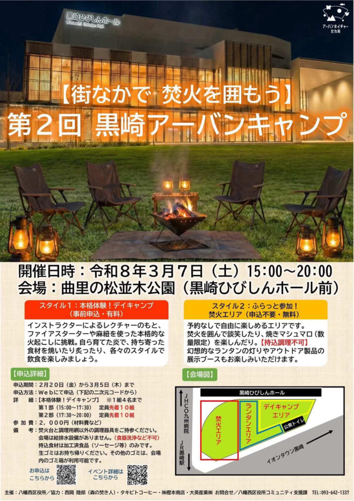 3月7日に開催される「第2回黒崎アーバンキャンプ」は、都市のど真ん中で“火”を囲み、アウトドア気分を味わえる人気イベントです。