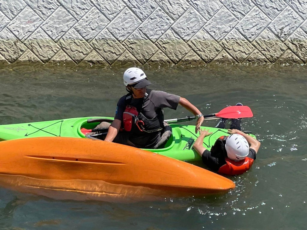 また、転覆してしまった場合は、カヌーの準備から指導までしていただいている、北九州市立 もじ少年自然の家の所長 西胤正弘さんがあっという間に救助に駆けつけてくれます。