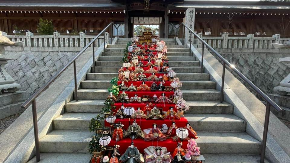 参拝客のお目当ては、境内に所狭しとひな人形が並べられる、岡田宮のひなまつり。