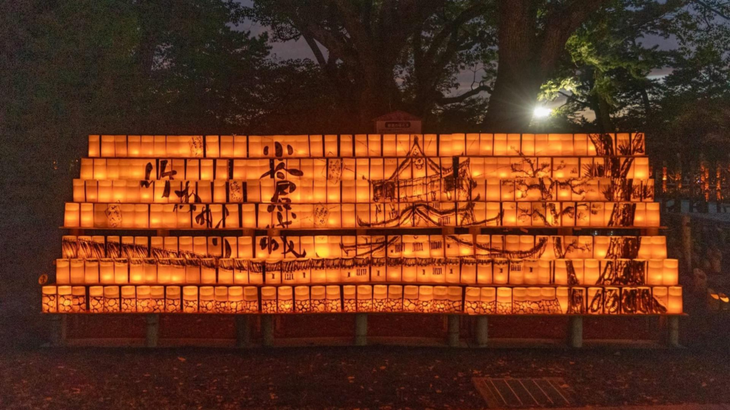 未来への希望と、SDGsの理念(放置竹林の活用)を込めた灯りが、新たなデザインとなって小倉の夜を彩ります。揺らめく光が織りなす繊細な地上絵、そして荘厳な小倉城とのコントラストは、ここでしか見ることのできない唯一無二の絶景です。