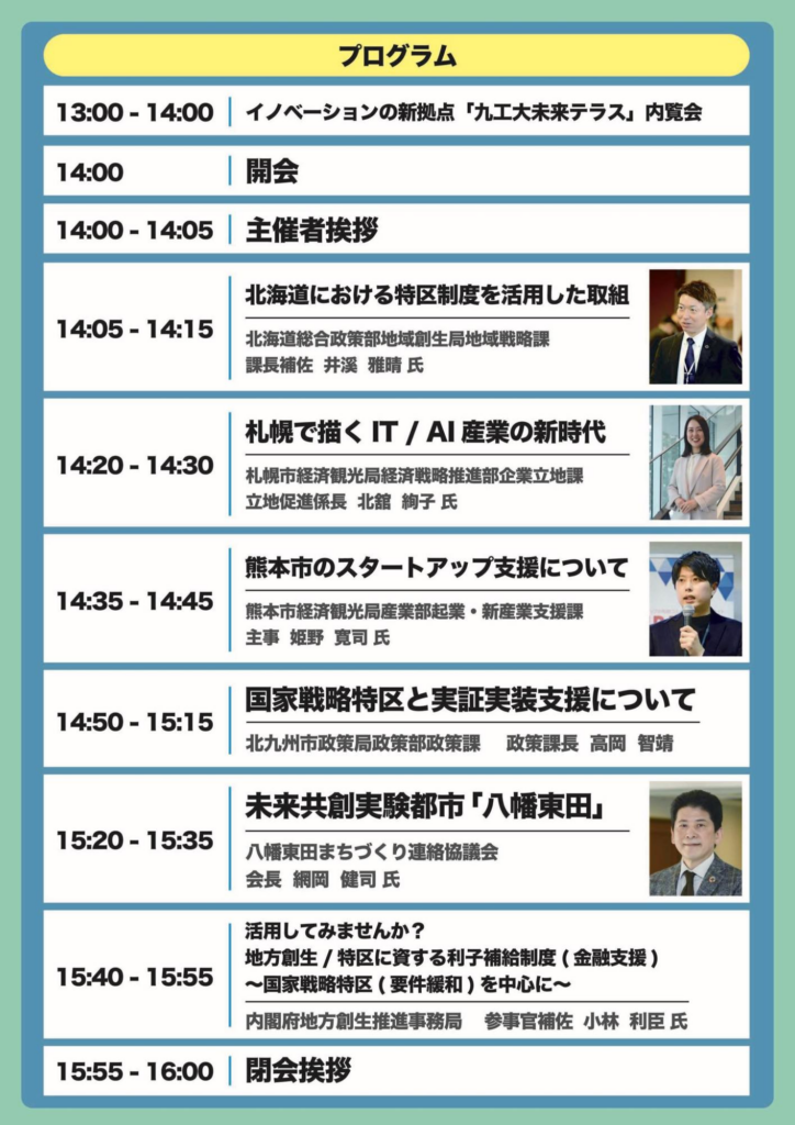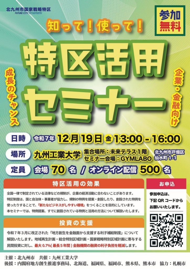 特区制度の仕組みや、全国の自治体がどのように活用しているか、北九州市がどんな未来を描いているのかを、わかりやすく学べる貴重な機会です。また、北海道、札幌市、熊本市など、特区活用に成功している自治体の実例発表もあり、未来のまちづくりが身近に感じられる内容になっています。