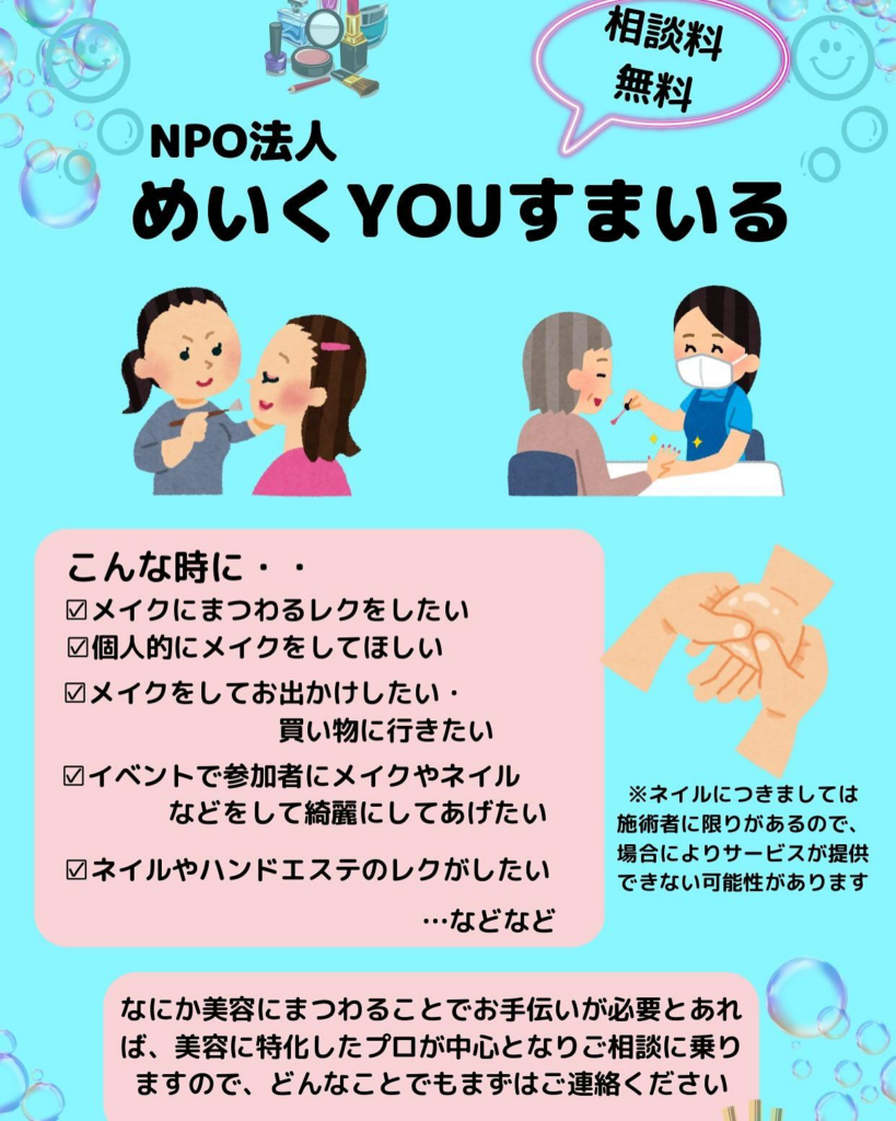 『めいくYOUすまいる』では、介護施設や就労支援施設、地域イベント、個人へのサービスなど、様々な形で美容の力を届けることで、心が明るくなる瞬間をお手伝いしています。