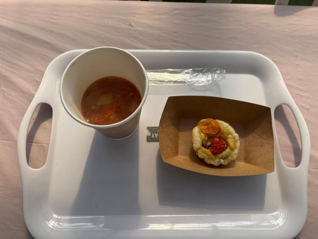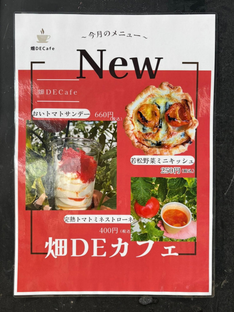 また休憩所の畑DEカフェでは、園内のトマトを使った、若松野菜ミニキッシュ、完熟トマトミネストローネ、そしてそして、意外なデザートとして、おいトマトサンデーを食べることもできます。