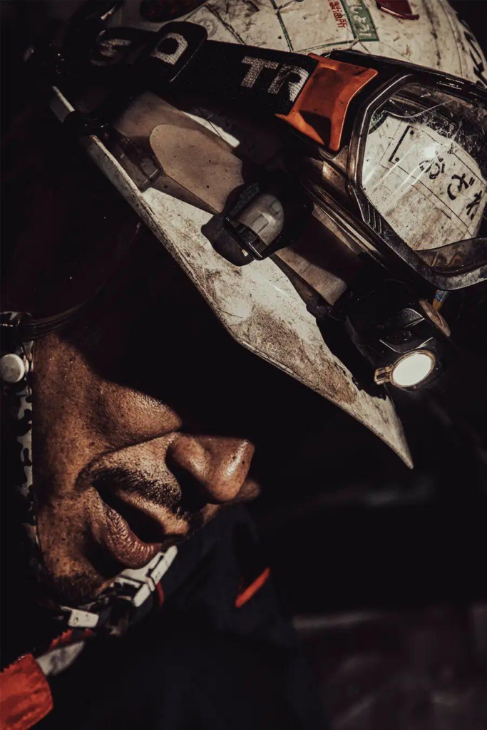 ヘルメットを外し、緊張から解放された表情。